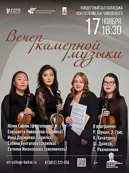 Произведения исполнят талантливые музыканты и преподаватели колледжа: Юлия Синюк (фортепиано), Елизавета Николаева (скрипка), Инна Доржиева (скрипка) и Сабина Булгатова (скрипка), а также Евгения Именохоева (виолончель).
