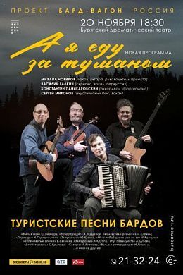 Программа называется «А я еду за туманом», а представит ее для Вас, дорогие зрители, проект «Бард-вагон»(Россия) . Несмотря на свой небольшой возраст, этот коллектив уже успел много поколесить по матушке России, выступая с концертами на престижных концертных площадках больших и малых городов , в т.ч и в Улан-Удэ , где завоевал симпатии и уважение зрителей.