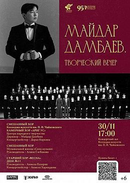 В концертном зале Колледжа искусств им. П.И. Чайковского 30 ноября в 17:00 пройдет творческий вечер руководителя Смешанного хора Майдара Дамбаева.