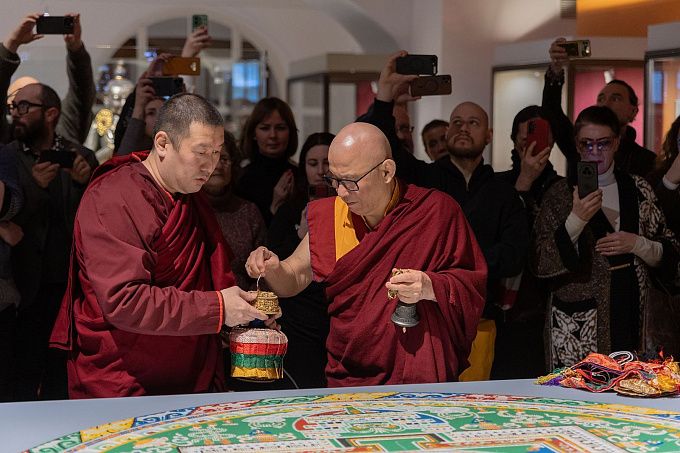 В Эрмитаже провели буддийский ритуал, символизирующий иллюзорность мира. Церемония началась с чтения молитвы, затем все элементы мандалы посвященную божеству милосердия, разобрали, сообщили в пресс-службе музея.