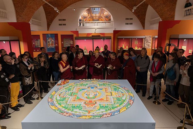 Мандалу, посвященную божеству милосердия, разрушили в Эрмитаже Рритуал символизирует иллюзорность мира.