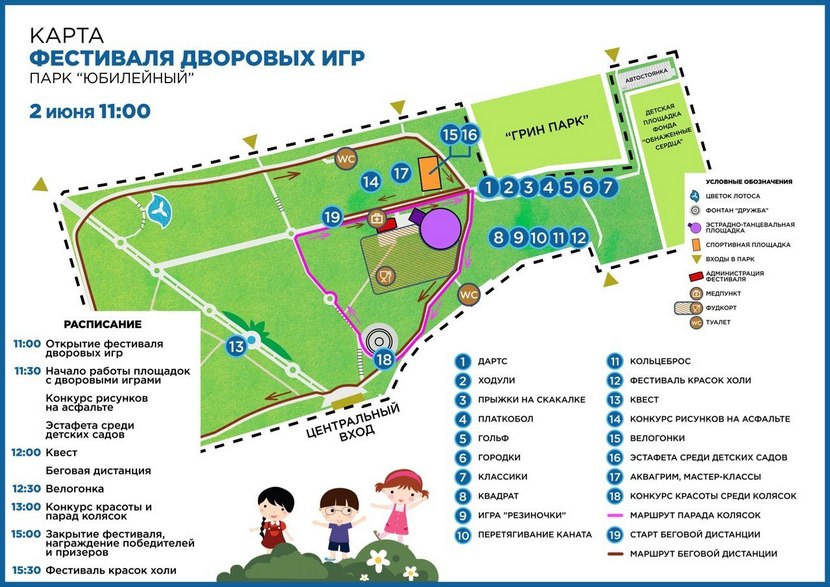 11:30 - 16:00 - работа площадок с дворовыми играми для средней группы детей (6-10 лет) на танцевальной площадке парка; мастер - классы от дома идей Lollypop; конкурс рисунков на асфальте;
