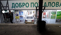 Иномарка съехала с крыльца и протаранил двери супермаркета.