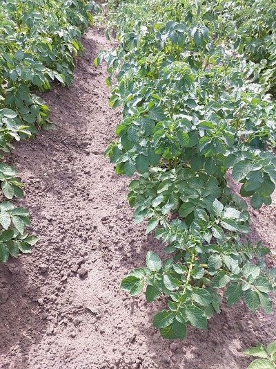 Ботва у картофеля этого сорта выглядит не очень яркой и пышной, но оценивать урожай еще рано. Рядом растет картофель из Белгорода и Воронежа, семена купили в одном из популярных маркетплейсов.