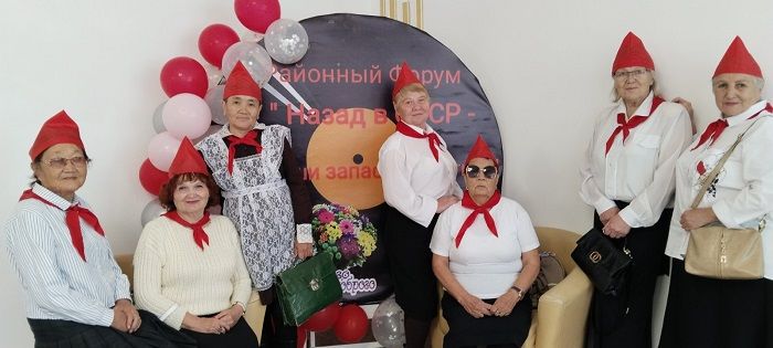 А на районный форум ко Дню пожилого человека делегаты от «Бархатного сезона» отправились в ретро-костюмах пионеров. Сшили красные пилотки, галстуки, нашелся даже галстук 1986 года выпуска с ценником. А у Токтохо Прокопьевны сохранилась ее школьная форма. Правда белое кружево фартука пожелтело и пришлось сшить новый. Дополнил образ  школьный портфель в стиле советского времени.