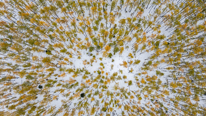 Ушканьи острова на Байкале покрылись первым снегом. Золотистые лиственницы оказались в белоснежном обрамлении на фоне ледяной глади озера.