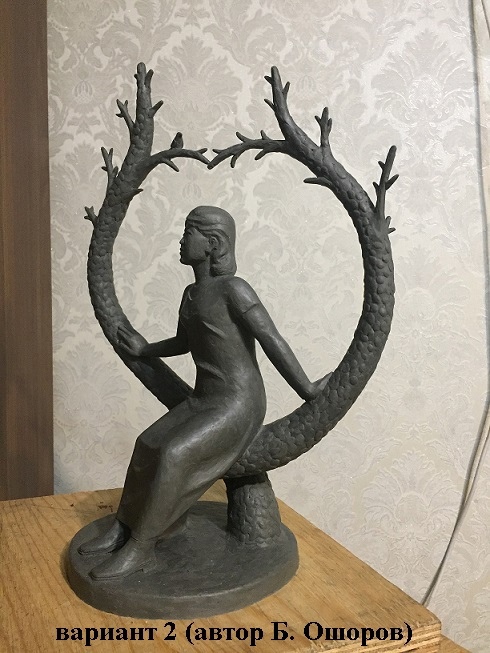 - Автор второго вариант памятника Б. Ошоров отметил, что «хочется сделать памятник Эржене Будаевой светлым, дабы память о ней осталась на долгие годы. Сквер, в котором будет поставлен памятник стал бы местом отдыха и притяжения людей всех возрастов. В моей работе Эржена сидит мечтательная, два дерева у основания сплетаются и образуют сердце, на которое она опирается, символизируя доброту и широту ее души».