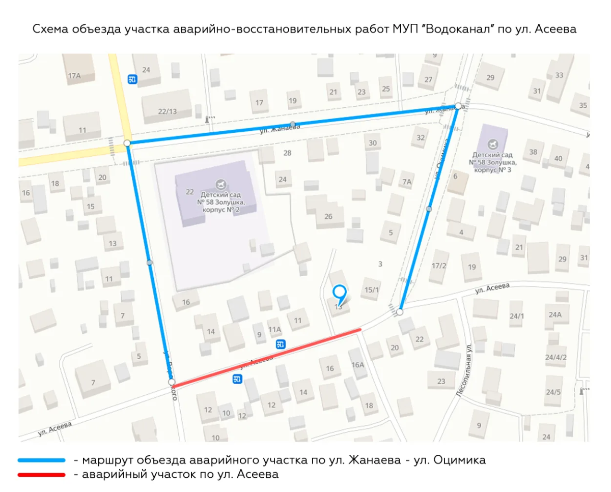 Дорогу перекрыли от перекрёстка ул. Асеева до перекрёстка ул. Воровского. В 9:30 коммунальщики приступили к работам и планируют завершить к полуночи 29 января. Водителей просят выбирать объездные пути, например, по маршруту ул. Воровского - Жанаева - Оцимика.