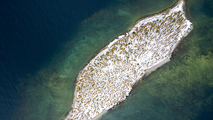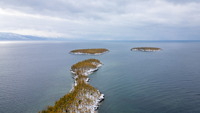 Ушканьи острова на Байкале покрылись первым снегом. Золотистые лиственницы оказались в белоснежном обрамлении на фоне ледяной глади озера.